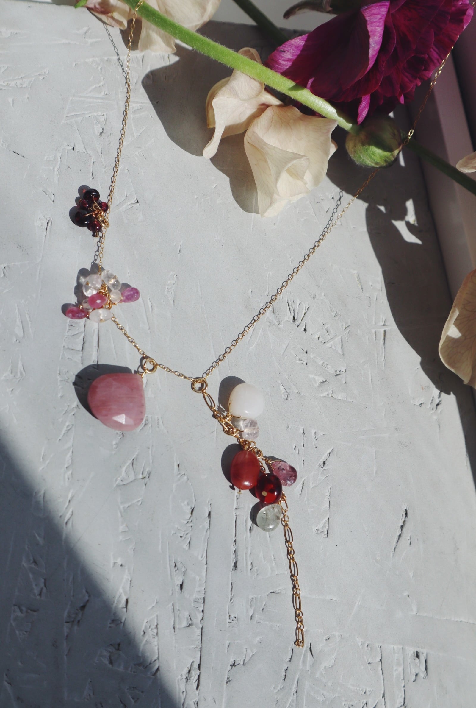ロードナイトを主役に、ガーネットやアンデシン、レッドアンバーで全体を引き締めて、ピンクオパールやモルガナイト、ローズクォーツで女性らしさを演出しました